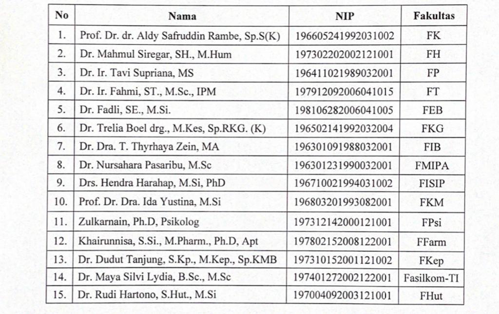 Adapun berikut ini merupakan 15 nama Dekan anyar USU yang resmi dilantik: