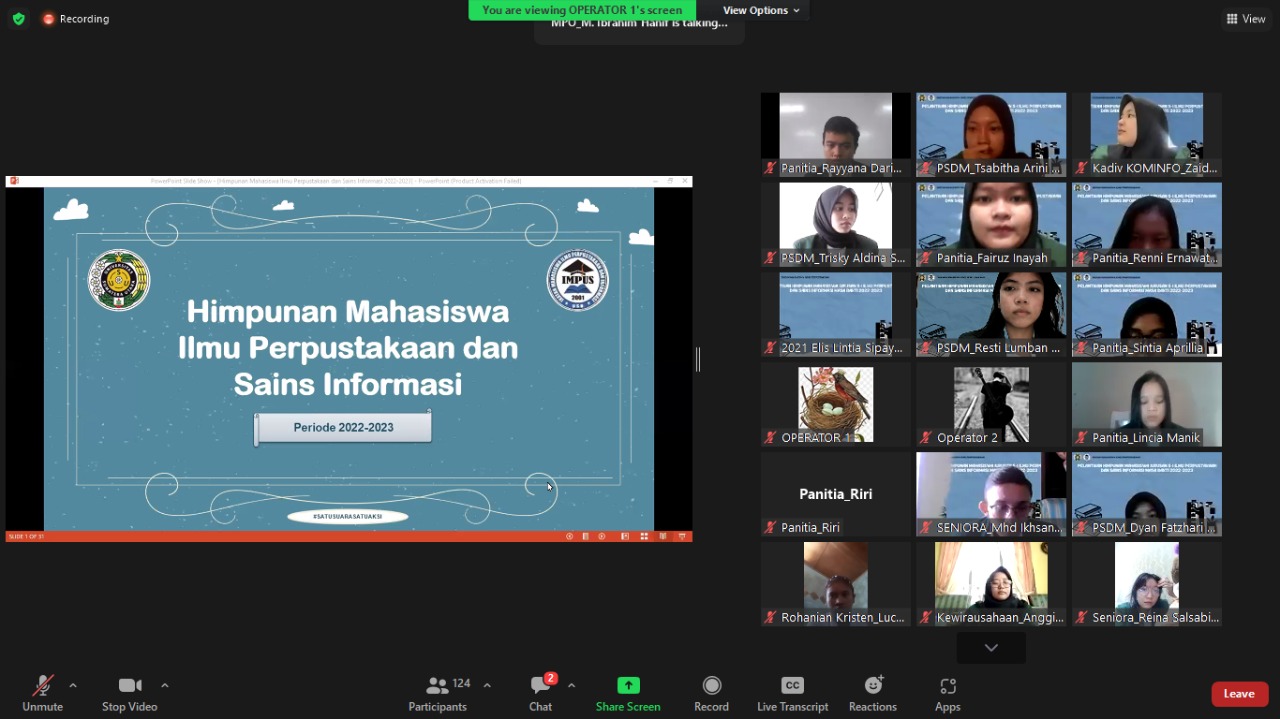 Suara USU, Medan. Himpunan Mahasiswa Jurusan (HMJ) Ikatan Mahasiswa Perpustakaan dan Sains Informasi (IMPUS) USU resmi melantik pengurus baru pada Sabtu (18/07) secara daring. Diadakan secara virtual melalui platform Zoom Cloud Meeting, 75 pengurus HMJ IMPUS periode 2022/2023 yang terdiri dari 3 orang BPH dan Kadiv beserta anggotanya dilantik oleh MPO (Majelis Permusyawaratan Organisasi) IMPUS yang juga merupakan MPO baru IMPUS di periode 2022/2023.
