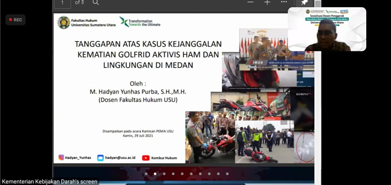 Kementrian Kebijakan Daerah PEMA USU menginisiasi lahirnya kegiatan Kamisan, pada Kamis (29/7/2021). Kamisan edisi kali ini membahas kejanggalan kematian aktivis HAM dan lingkungan, Golfrid Siregar.
