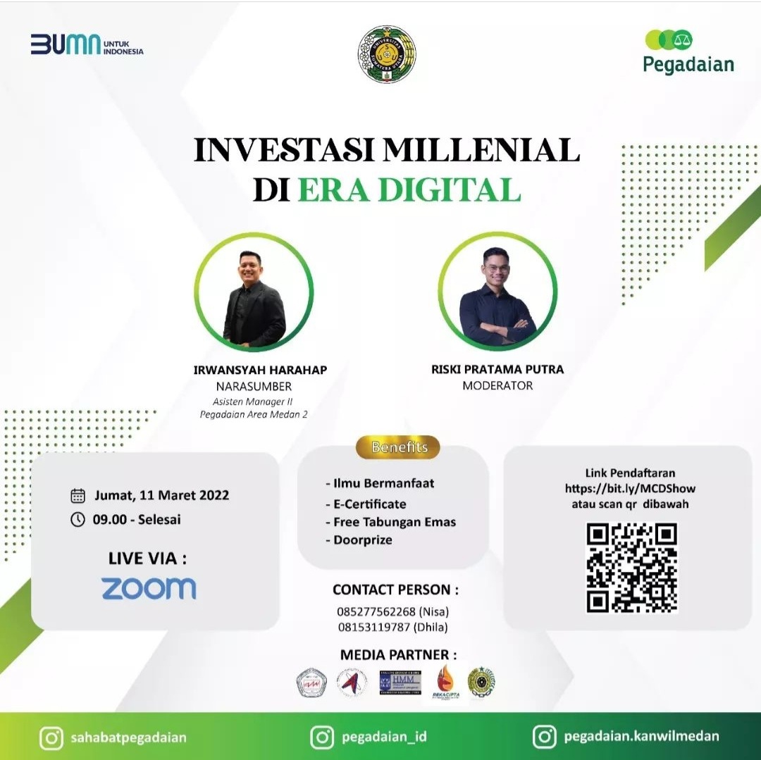 Suara USU, Medan. PT Pegadaian Area Medan 2 telah melangsungkan webinar bertajuk “Investasi Milenial di Era Digital” yang lebih ditujukan kepada mahasiswa baru Fakultas Ekonomi dan Bisnis (FEB) Universitas Sumatera Utara (USU). Kegiatan ini diadakan melalui Zoom Meeting, pada Jumat (11/03).