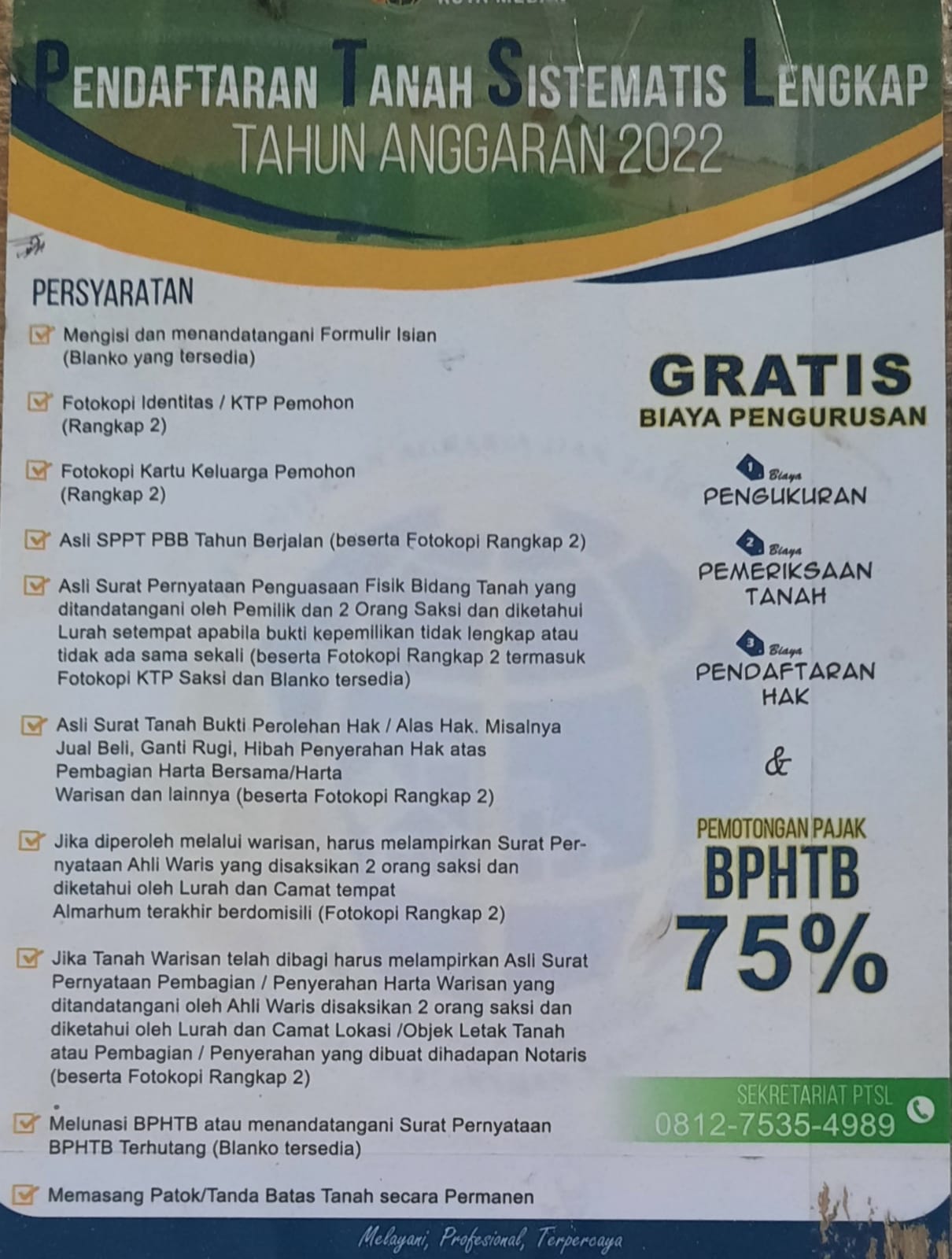 “Dari tahun 2017 sudah ada di Kota Medan, tetapi setiap tahunnya dilaksanakan di kecamatan maupun kelurahan yang berbeda, tergantung dari ketua ajudikasinya mau mengajukan di daerah mana,” terang Ivanda, Satgas Yuridis PTSL di Kelurahan Sei Sikambing B, Medan.