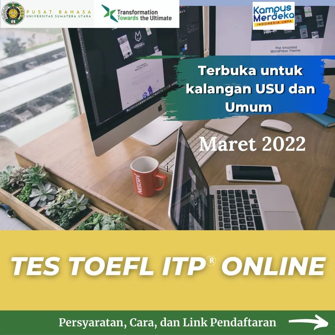 Suara USU, Medan. Pusat bahasa USU adakan Tes TOEFL ITP secara daring untuk bulan Maret 2022, terbuka untuk kalangan USU maupun umum. Kegiatan ini dilakukan sebanyak 3 gelombang pada tanggal 9, 16, 23 Maret 2022. Tes ini diadakan sebanyak 2 sesi, setiap gelombangnya dengan kuota 12 orang/sesi.