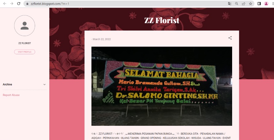 ZZ Florist merupakan salah satu UMKM yang bergerak dalam bidang jasa penyewaan karangan bunga yang beralamat di Jl. H.T. Rizal Nurdin, No. 28, Kec. Perbaungan, Kabupaten Serdang Bedagai, Sumatera Utara. Berdiri pada tahun 2015, ZZ Florist menyediakan papan bunga berbagai ukuran dengan aneka bunga tiruan.