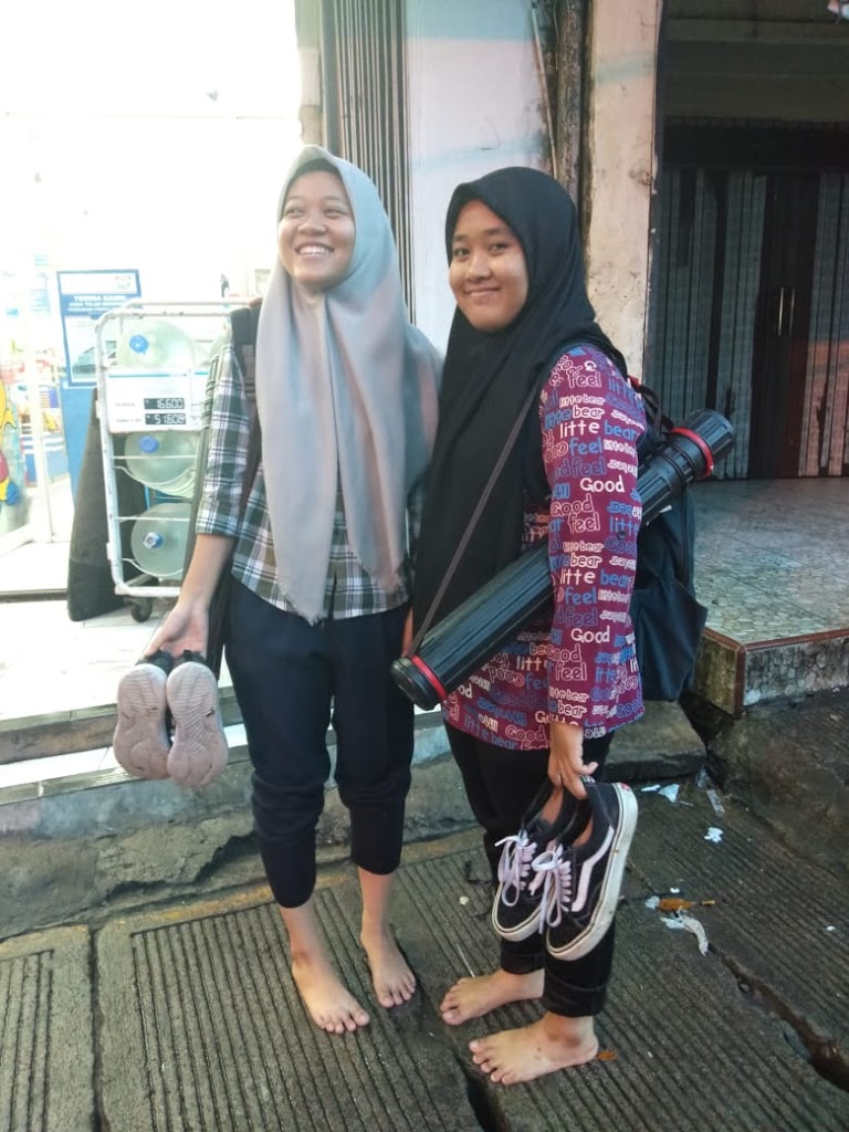 (Mahasiswa USU berjalan tanpa menggunakan alas kaki karena banjir) |