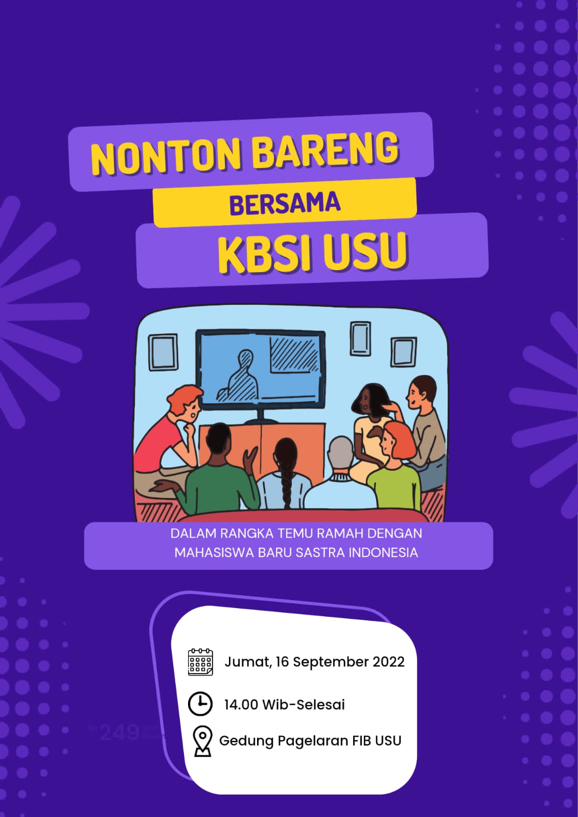Acara dimulai pukul 14.00 WIB hingga pukul 17.00 WIB. Acara ini diawali dengan pembukaan MC oleh Ahmad Dzaki dari stambuk 2020, dilanjutkan dengan inti acara, yakni nonton bersama serta diskusi dan sharing antarmahasiswa Sastra Indonesia.