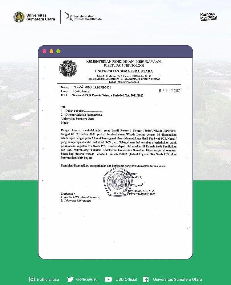 Suara USU, Medan. Universitas Sumatera Utara akhirnya adakan wisuda luring pertama selama masa pandemi ini. Beberapa waktu lalu akun Instagram @official.usu memposting surat edaran perihal wisuda luring bagi wisudawan periode I TA. 2021/2022. Pada surat edaran tersebut diberitahukan bahwa untuk mengikuti acara wisuda luring, wisudawan harus menyertakan bukti tes hasil Swab PCR yang sampelnya diambil maksimal 3x24 jam.