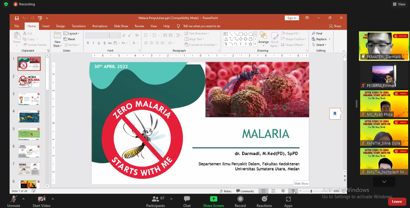 Suara USU, Medan. Dalam rangka Hari Malaria Sedunia yang jatuh pada 25 April 2022, Pengabdian Masyarakat MIND FK USU mengadakan webinar bertajuk Little Steps to Zero Malaria : Start With Me pada Sabtu (30/04/22). Webinar ini dilaksanakan secara daring melalui zoom meeting dan terbuka untuk umum.