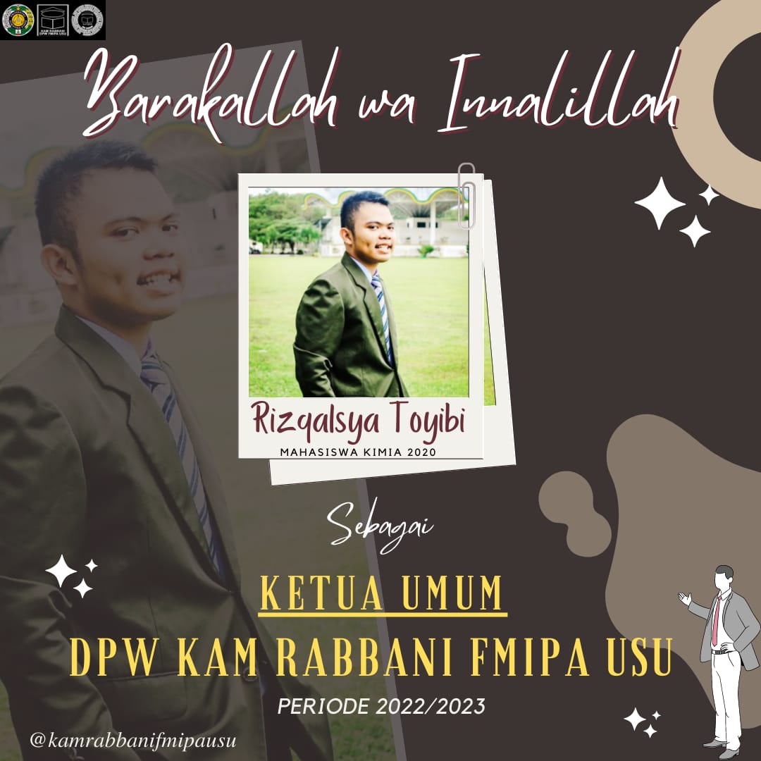 Suara USU, MEDAN. Rizqalsya Toyibi, mahasiswa Program Studi Kimia Fakultas Matematika dan Ilmu Pengetahuan Alam (FMIPA) telah diamanahkan menjadi ketua baru KAM Rabbani (21/06). Terpilihnya mahasiswa stambuk 2020 ini akan maju ke tahap pelantikan yang diperkirakan akan dilaksanakan secara offline nanti. Kegiatan pelantikan tersebut juga akan dihadiri para kader dan tamu undangan.