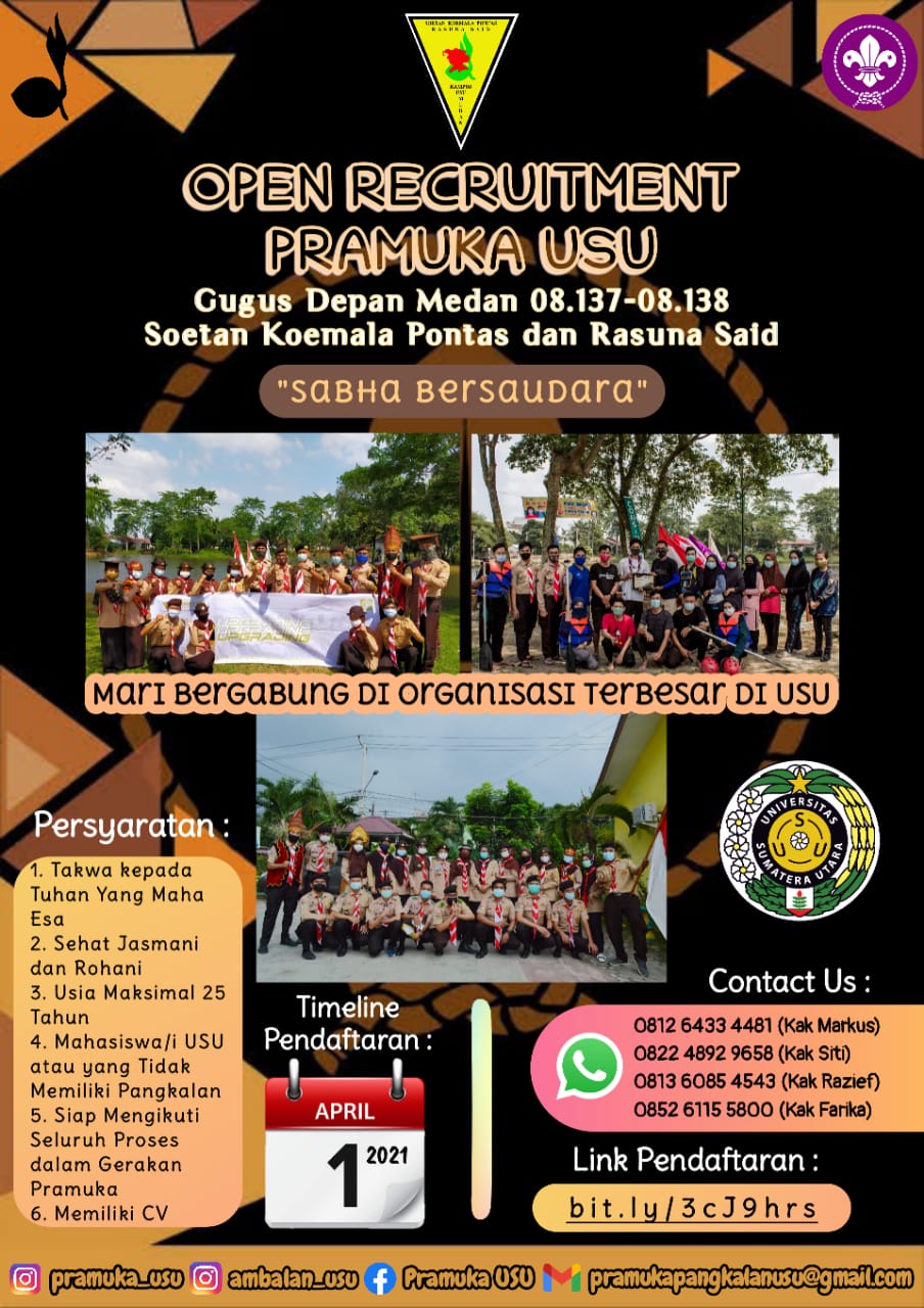 Untuk info lebih lengkapnya bisa dibuka di instagram@pramuka_usu dan @ambalan_usu untuk pendaftaran bisa diakses melalui link https://bit.ly/3cJ9hrs. Bersama Pramuka, wujudkan baktimu pada Negara!