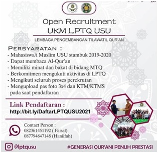 Suara USU, Medan. Ada kabar gembira dari UKM LPTQ untuk mahasiswa/i USU stambuk 2019-2020. UKM ini sedang melangsungkan open recruitment untuk pengurus magang. UKM LPTQ menawarkan empat bidang, yaitu bidang musabaqah, tarbiyah, silaturahmi, dan nasyid. Pendaftaran akan dimulai tanggal 15-25 Maret 2021 melalui link pendaftaran http://bit.ly/DaftarLPTQUSU2021.
