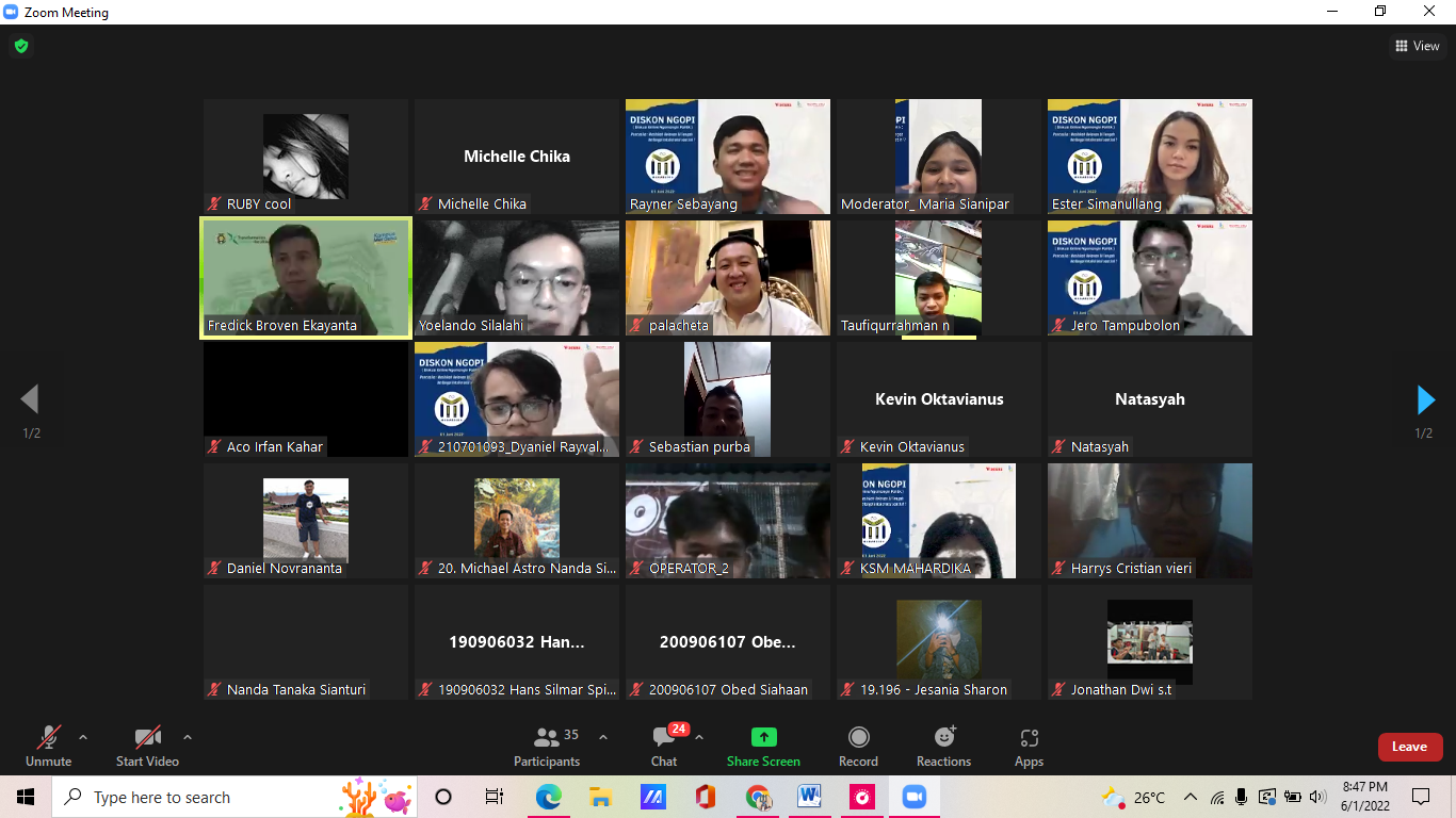 Suara USU, Medan. Bertepatan dengan hari lahir Pancasila, KSM Mahardika mengadakan konsep webinar politik dengan mengangkat tema “Pancasila : Masikah Relevan di Tengah berbagai Intoleransi saat ini?” pada Rabu (01/05).Webinar ini dihadiri oleh 3 narasumber, yaitu Ezra Palacheta Subies selaku Ketua Umum HIPMI Kota Medan, Fredrick Broven Ekayanta S.IP, M.IP selaku Dosen Ilmu Politik FISIP USU, dan Ester Dian Angelina selaku Founder dari Bangunasa.id.