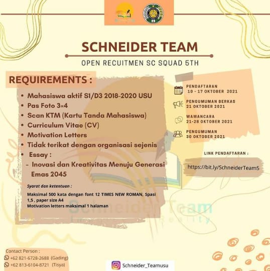 Suara USU, Medan. Scneider Community kini membuka pendaftaran. Pendaftaran dibuka mulai tanggal 10-17 Oktober 2021 dan dikhususkan untuk mahasiswa angkatan 2018-2020. Untuk menjadi anggota tetap Schneider, para peserta harus mengikuti alur pendaftaran dari tahap berkas, wawancara dan pengumuman. Hal ini diinformasikan di akun instagram @schneider_teamusu.