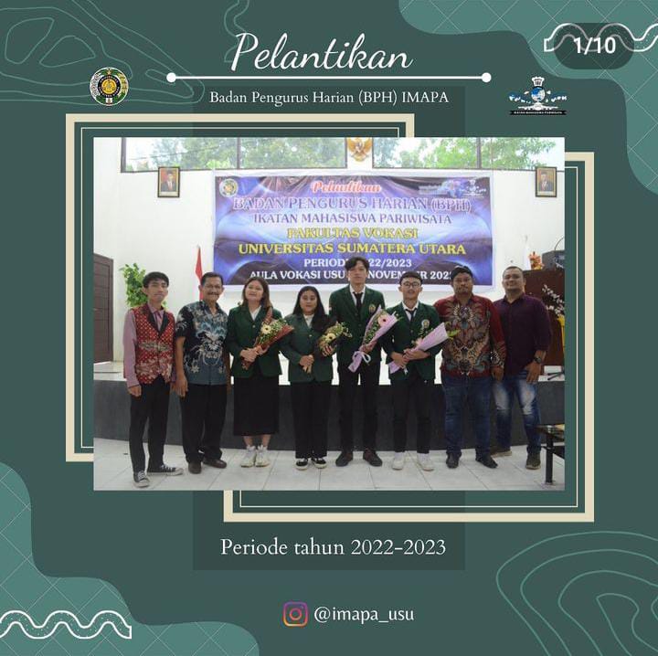 Suara, USU. MEDAN. Ikatan Mahasiswa Parawisata (IMAPA) USU tetapkan pengurus baru periode 2022-2023. Pelantikan William selaku ketua terpilih dan 13 anggota baru lainnya berlangsung dengan lancar di Aula Vokasi USU (18/11).