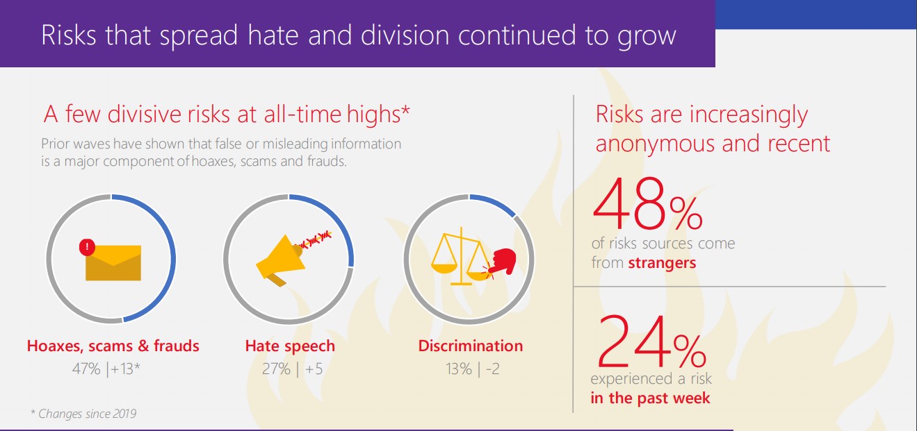 Paling tinggi adalah hoaks dan penipuan yang naik 13 poin ke angka 47 persen. Kemudian faktor ujaran kebencian yang naik 5 poin, menjadi 27 persen. Dan ketiga adalah diskriminasi sebesar 13 persen, yang turun sebanyak 2 poin dibanding tahun lalu (2020).