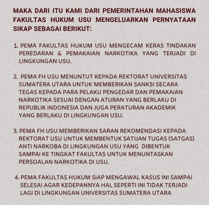 "Hari ini kami melakukan pernyataan sikap, karena kami menilai ini merupakan kasus besar, punya urgensi besar, yang membutuhkan perhatian khusus karena efek daripada kasus ini tidak hanya menyangkut orang yang ditangkap BNN, tetapi ini mengangkat citra USU, bagaimana reputasi USU, bagaimana akreditasi USU kedepannya. Itu yang kami pandang, makanya kami mengeluarkan pernyataan sikap," pungkas Husni.