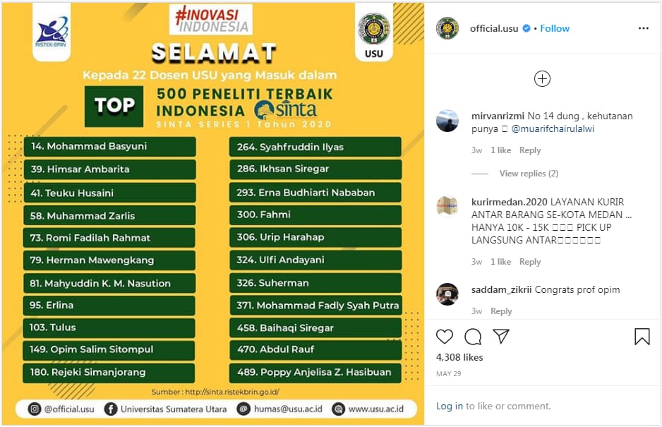 Di kalangan para dosen dan peneliti, SINTA Award merupakan ajang untuk melakukan sejumlah publikasi riset. Kali ini, sebanyak 22 dosen USU mendapat penghargaan kategori 500 peneliti terbaik Indonesia. Nama-nama dosen tersebut telah dirangkum dalam postingan akun resmi instagram USU @official.usu.